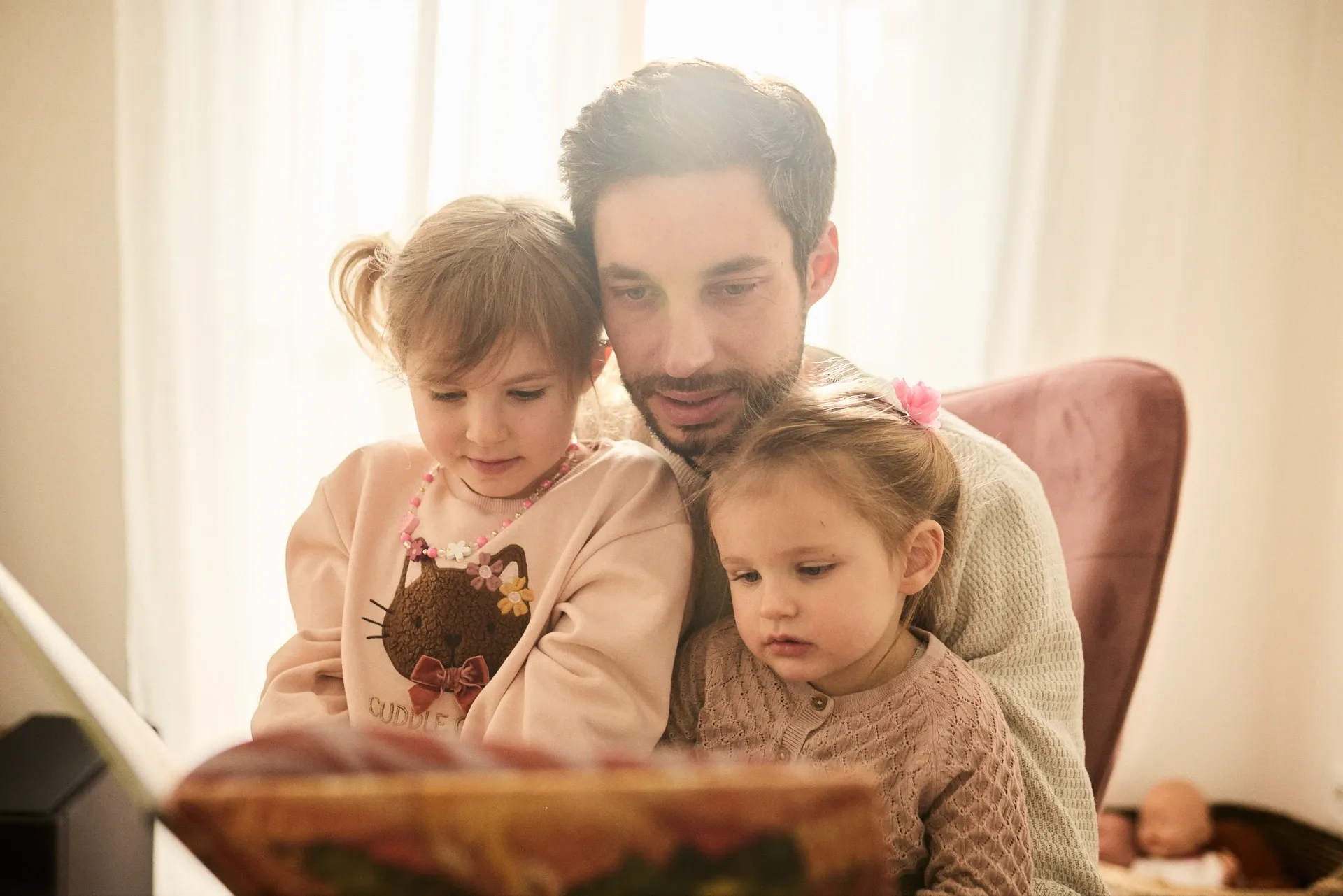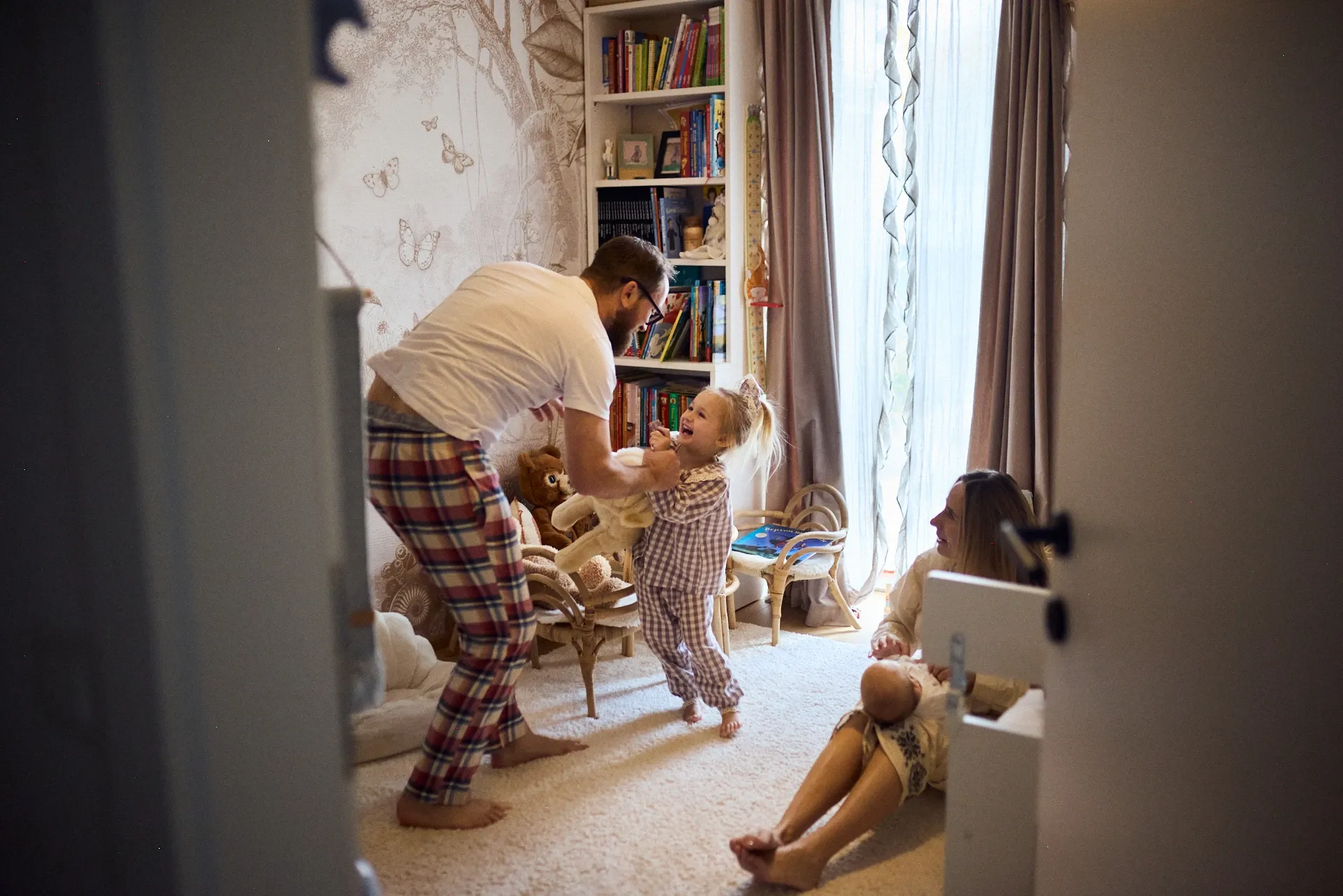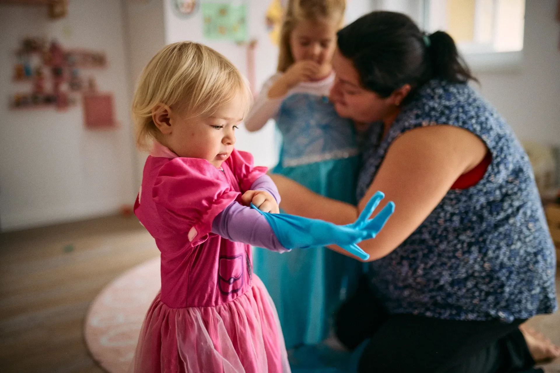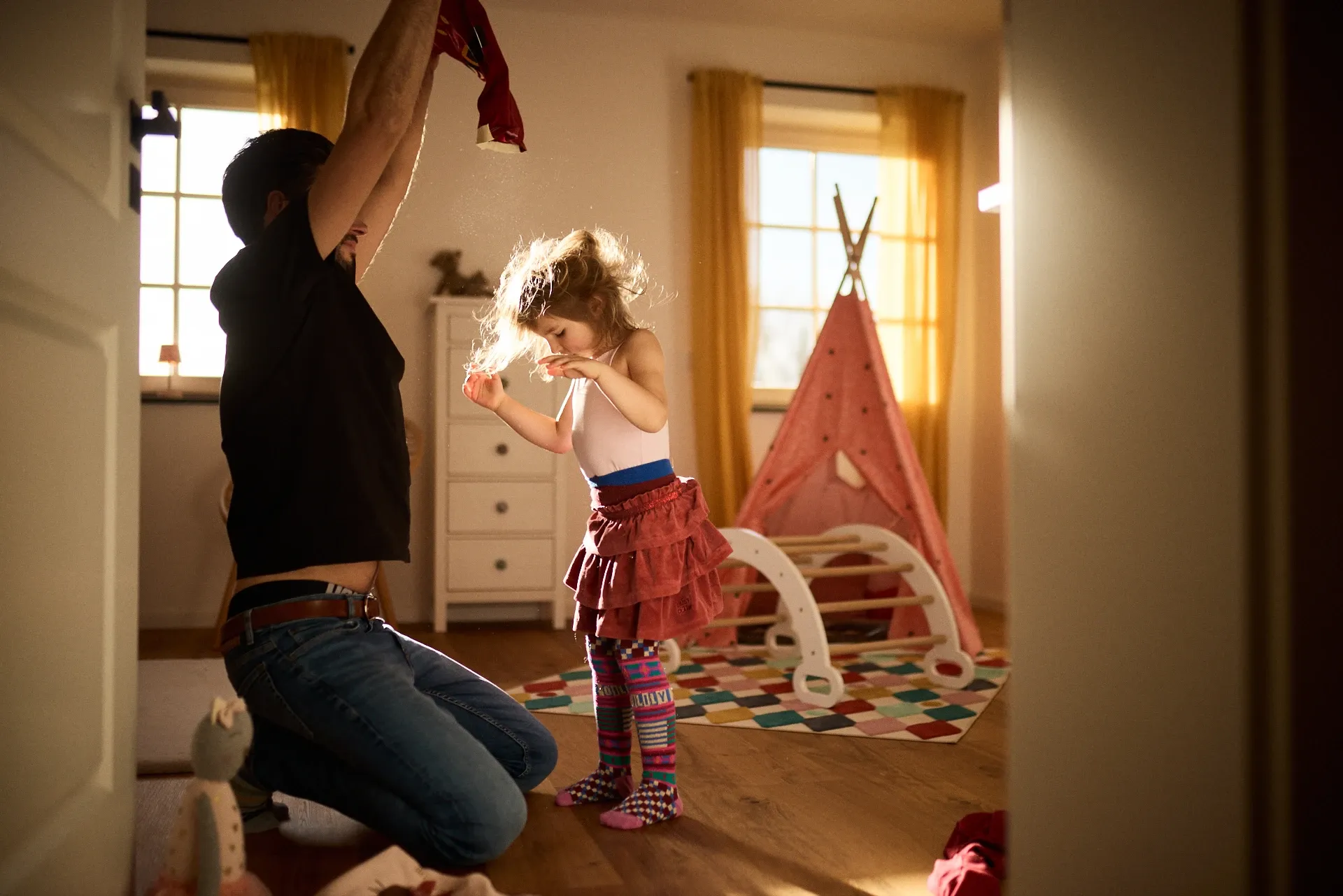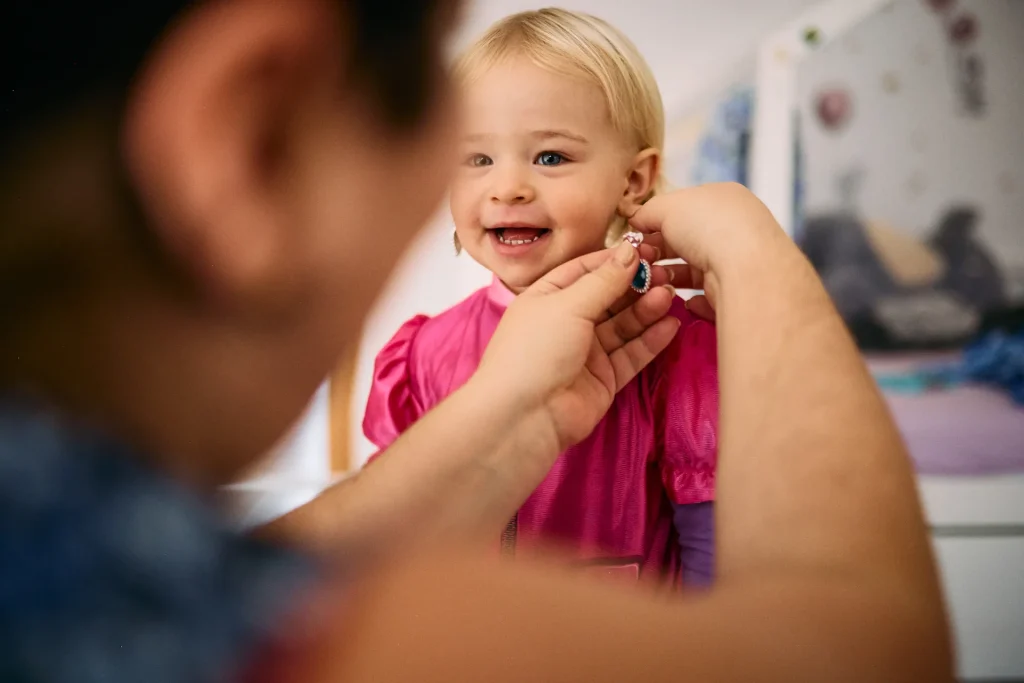 Strumpfhosen anziehen, lachen, Buch schauen, liebevoll in die Augen gucken zu sanften